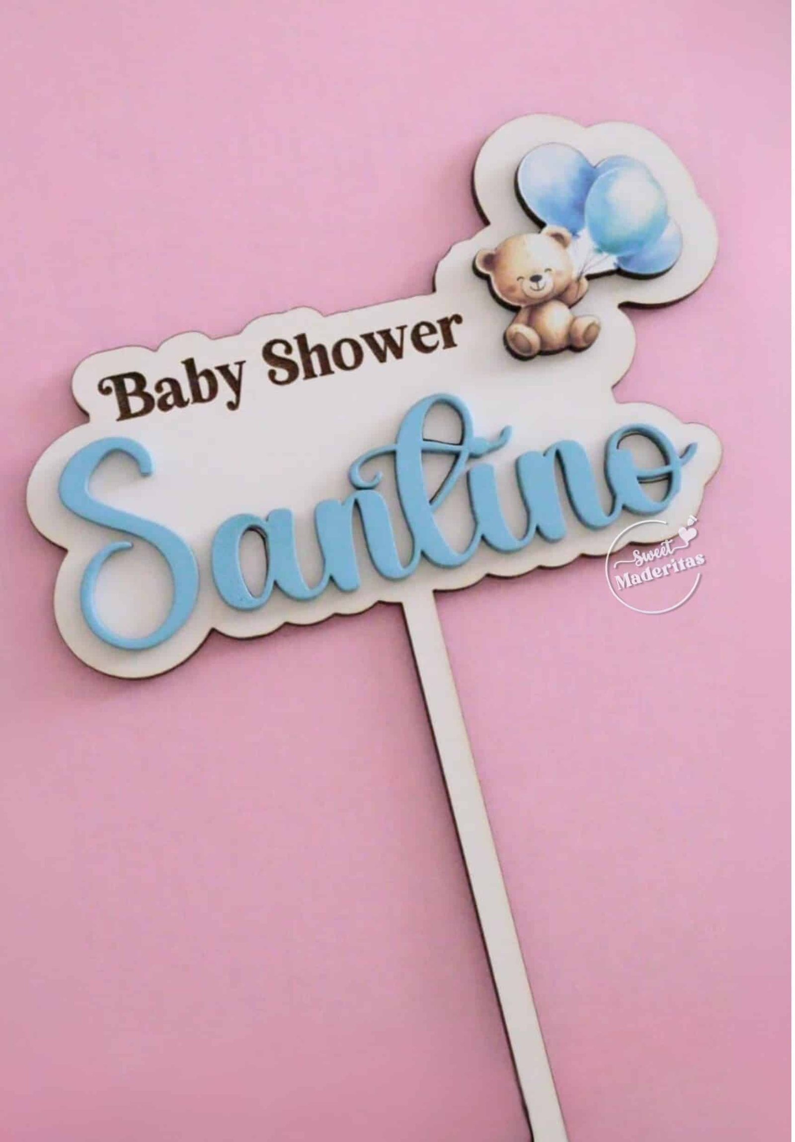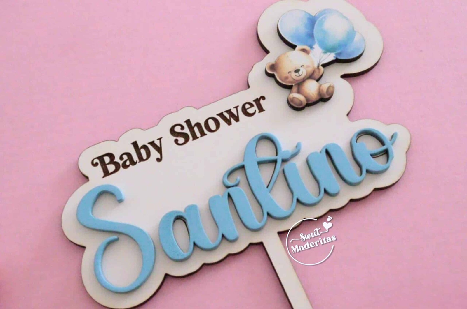 Celebra con este cake topper personalizado osito con globos, elaborado en maderita.