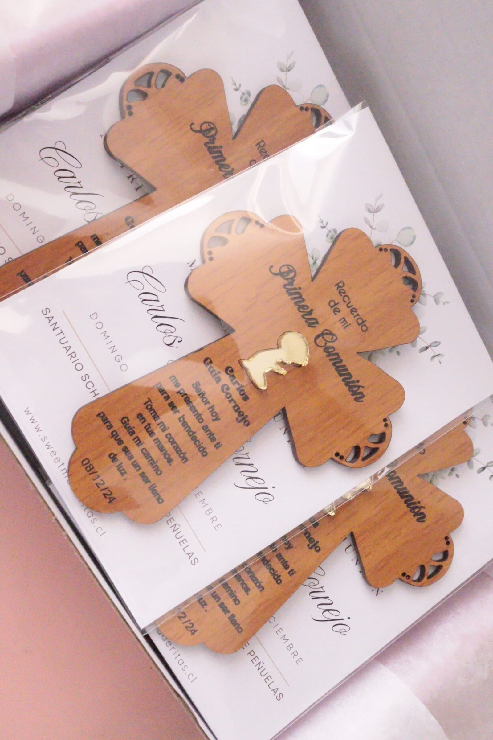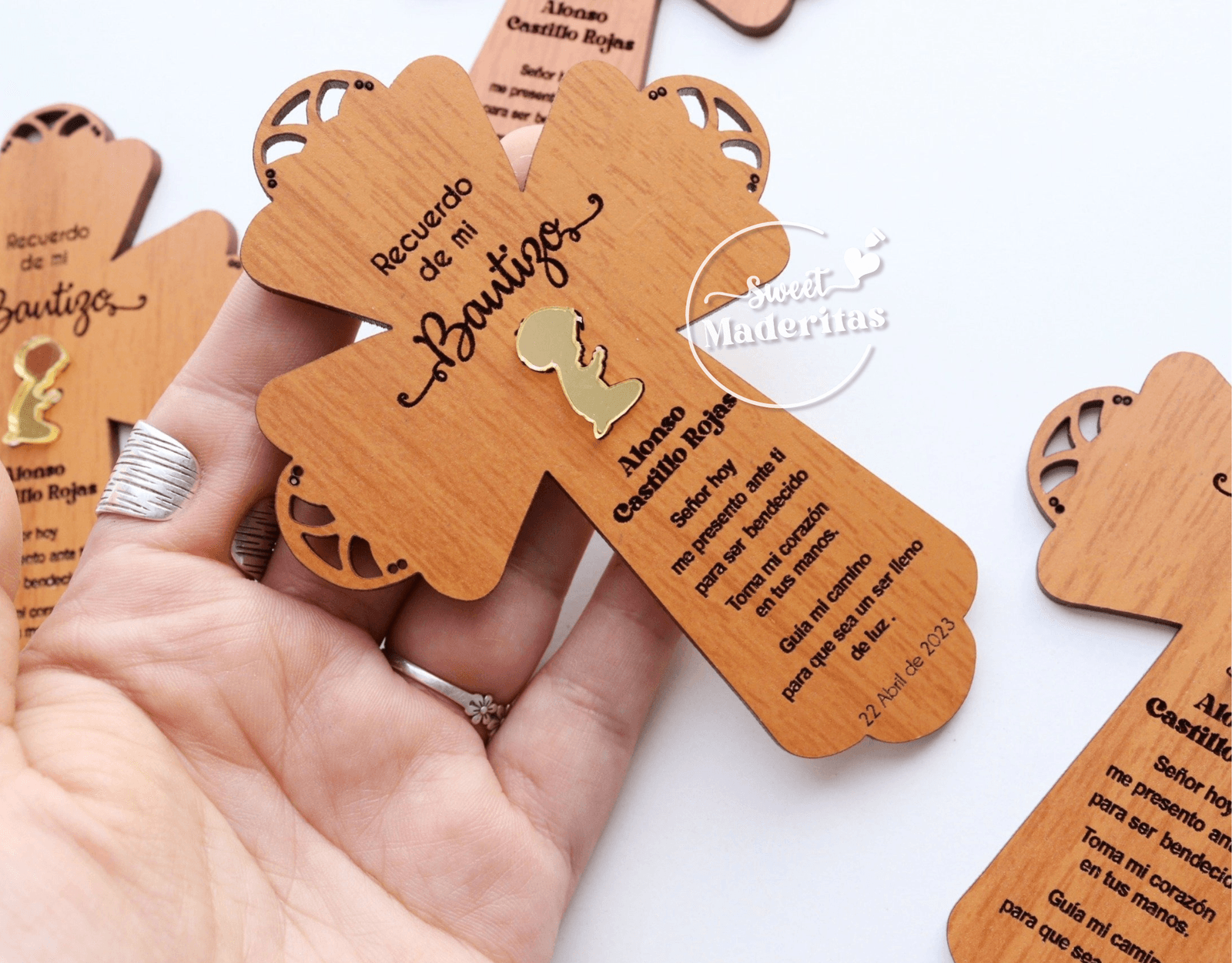Cruz grabada con oración , incluye silueta niñ@ en acrílico dorado, recuerdito ideal para bautizo o Primera Comunión 🕊️ Si quieres colocar un texto personalizado escribenos al wsp !