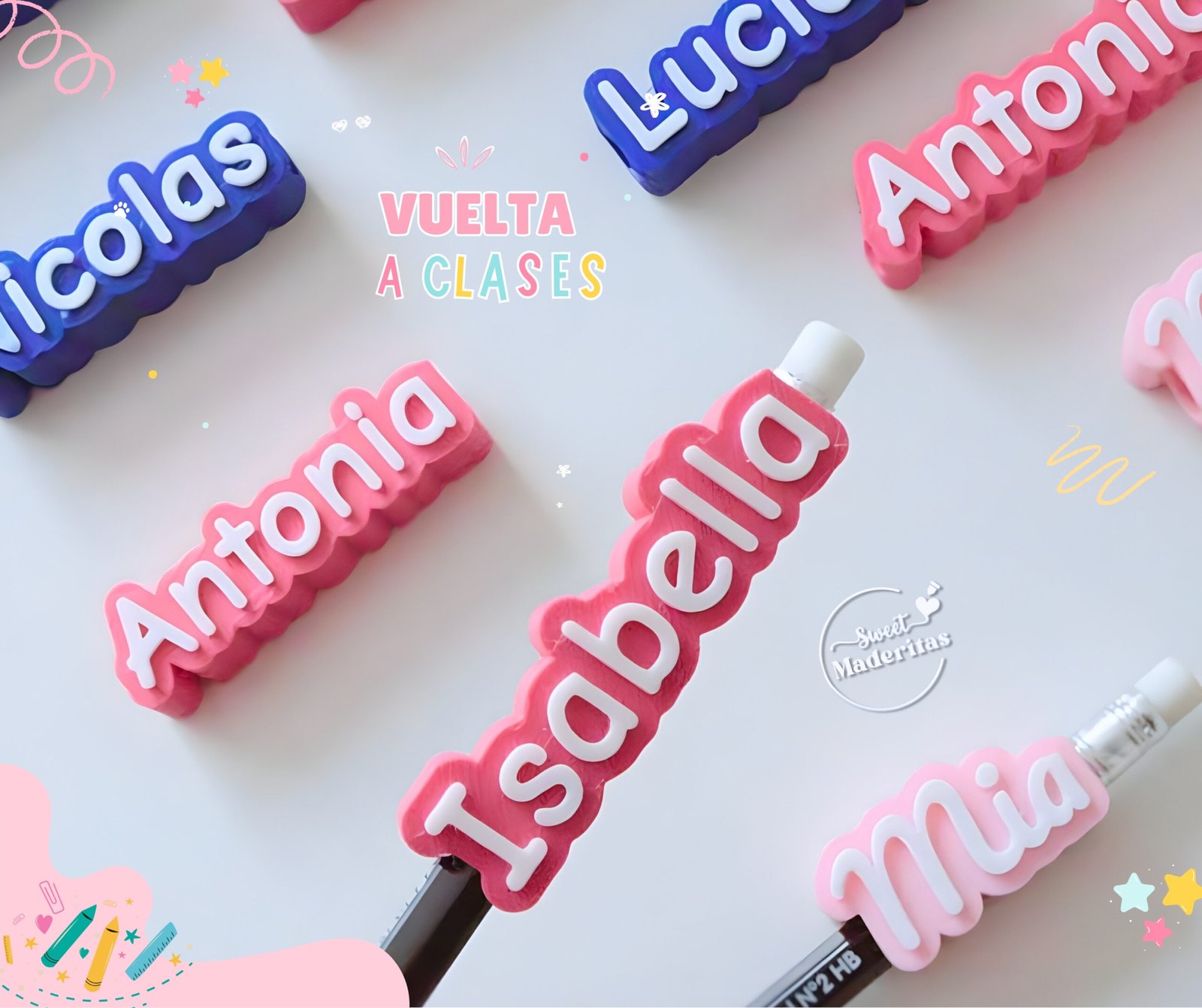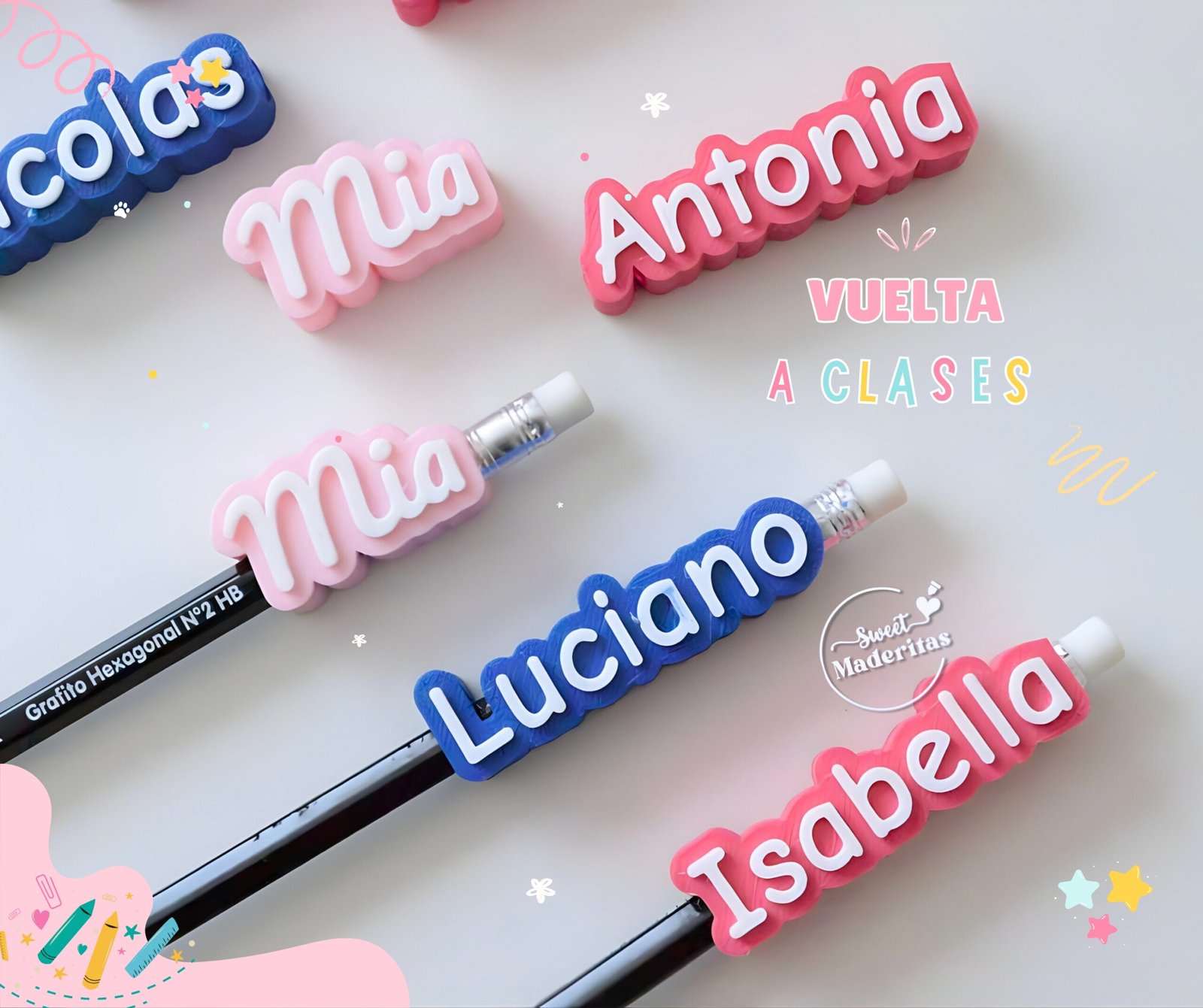 Este set de 6 identificadores para lápices, esta diseñado para acompañarte todo el año, olvidate de los utiles extraviados.