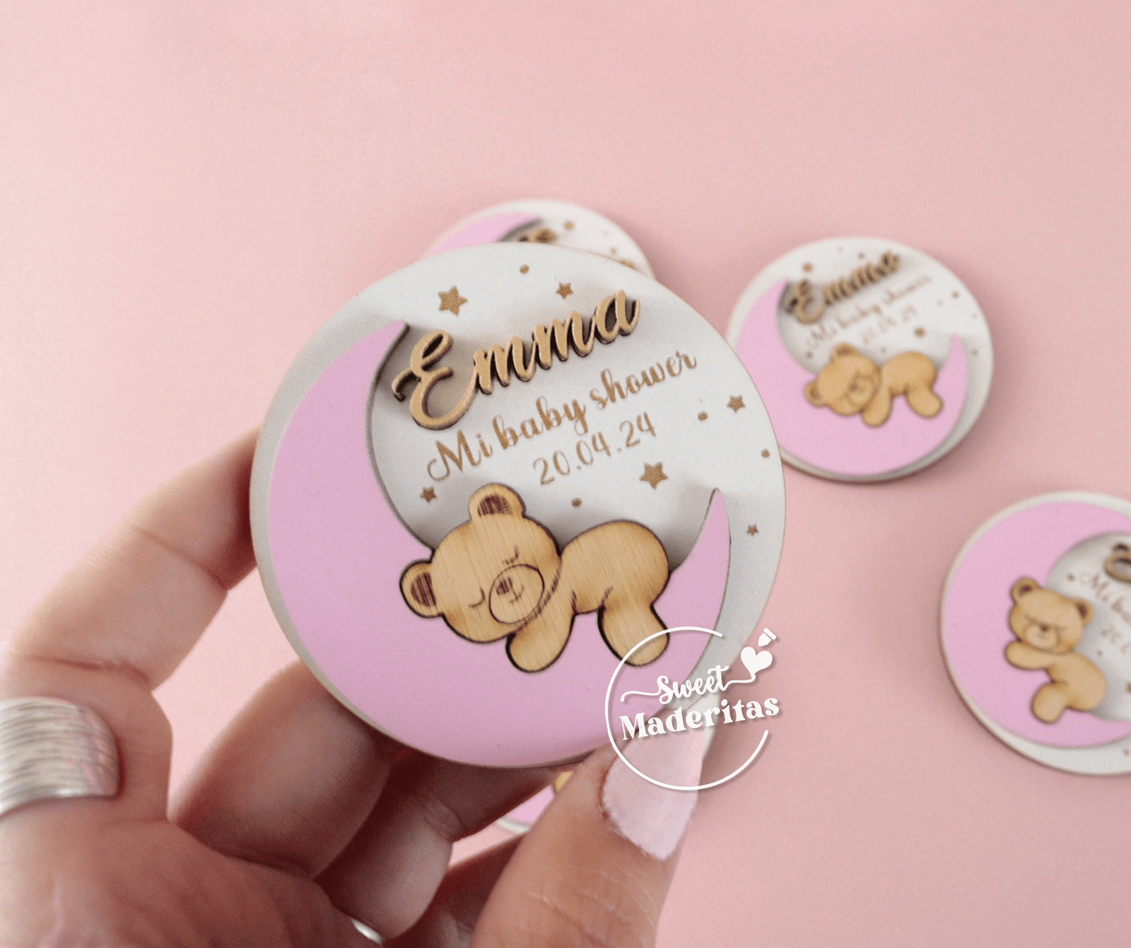 Recuerditos para baby shower oso , el nombre va en pintado en color dorado, imantados cada uno en su bolsita de organza listo para regalar 🎁