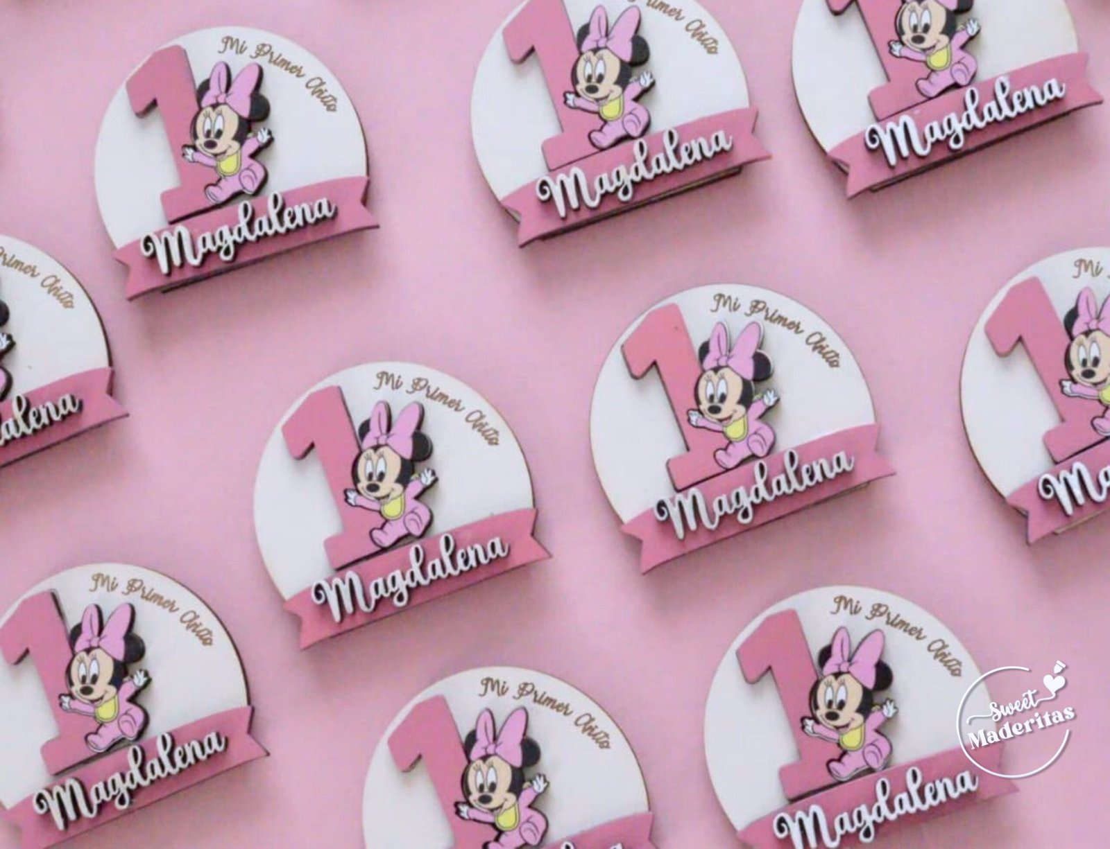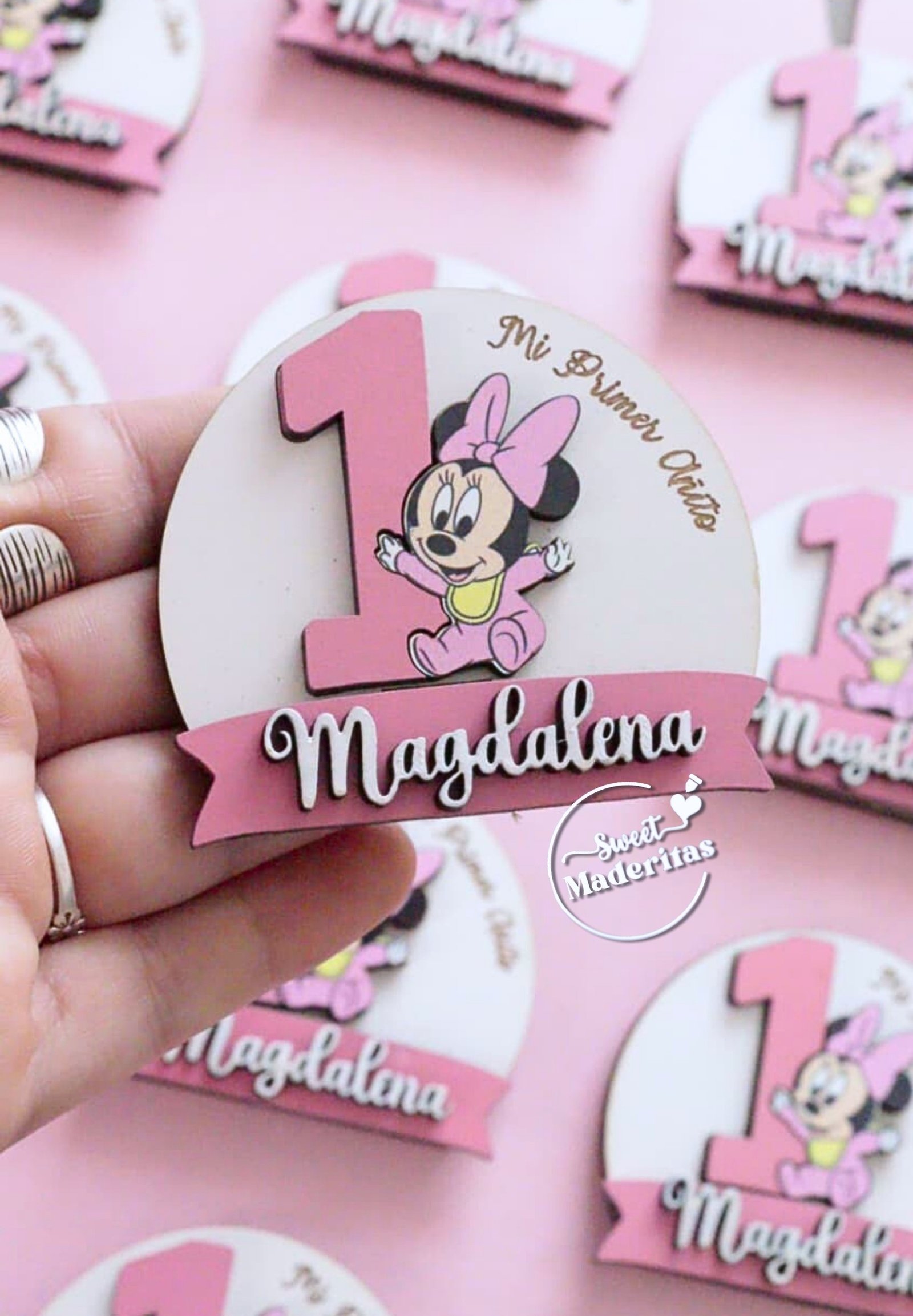 Recuerdos imantados de Minnie bebé , para evento de cumpleaños y 1 nombre en relieve