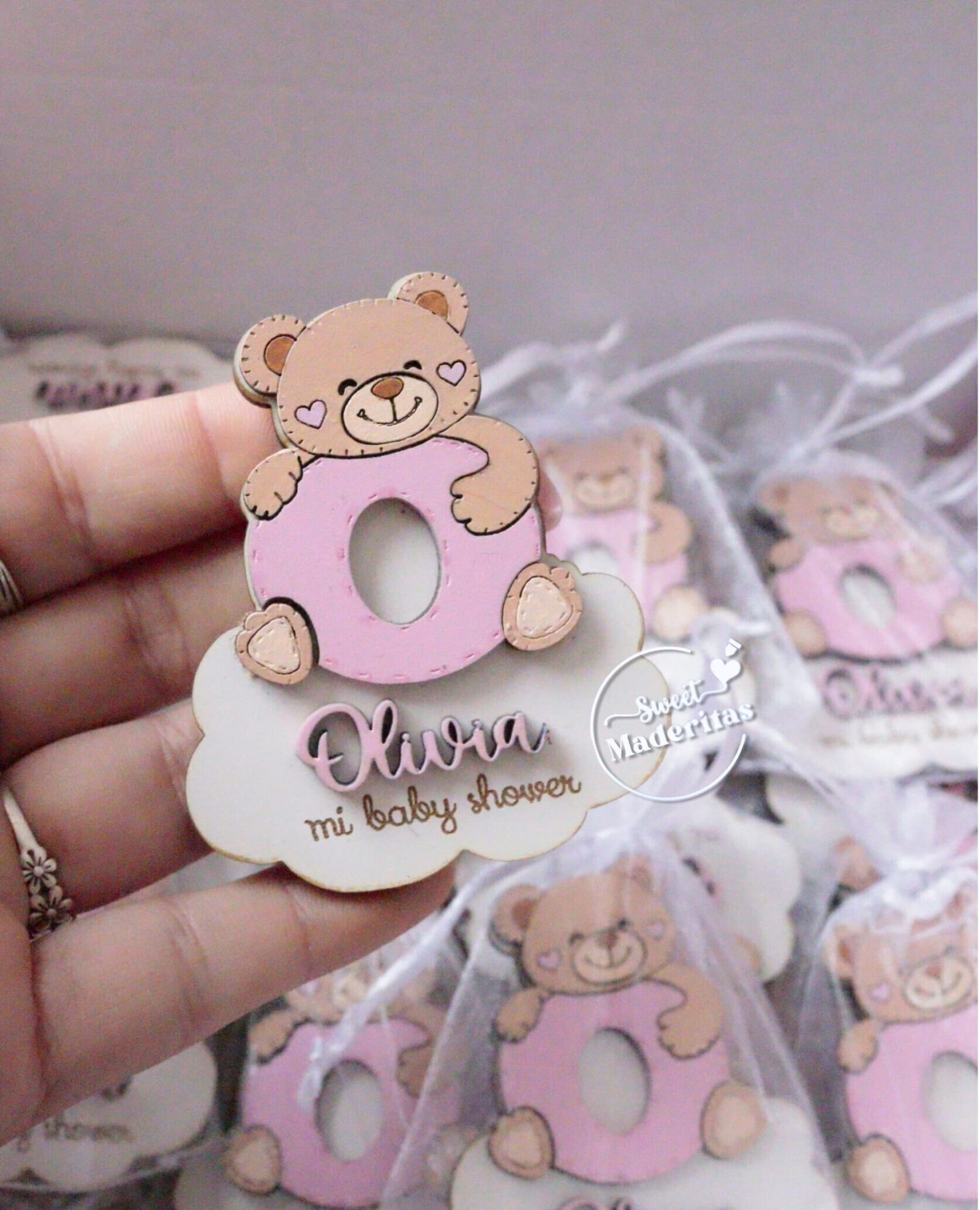 Recuerditos Cumpleaños ,baby shower imantados con figurita osito con letra O y 1 nombre en relieve , cada uno en su bolsita de organza listo para regalar 🎁