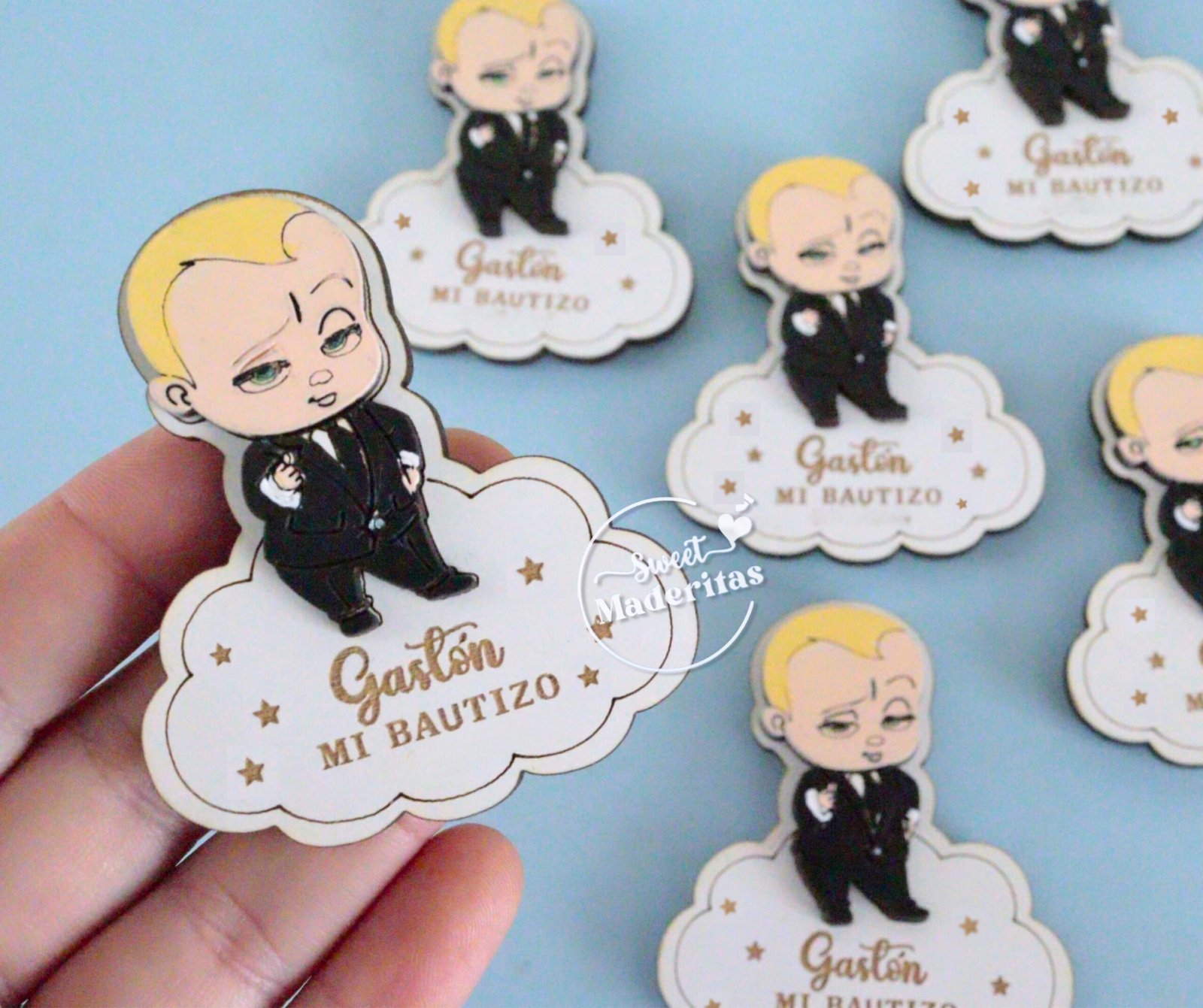 Recuerditos Cumpleaños ,baby shower imantados con figurita bebe jefe , cada uno en su bolsita de organza listo para regalar 🎁