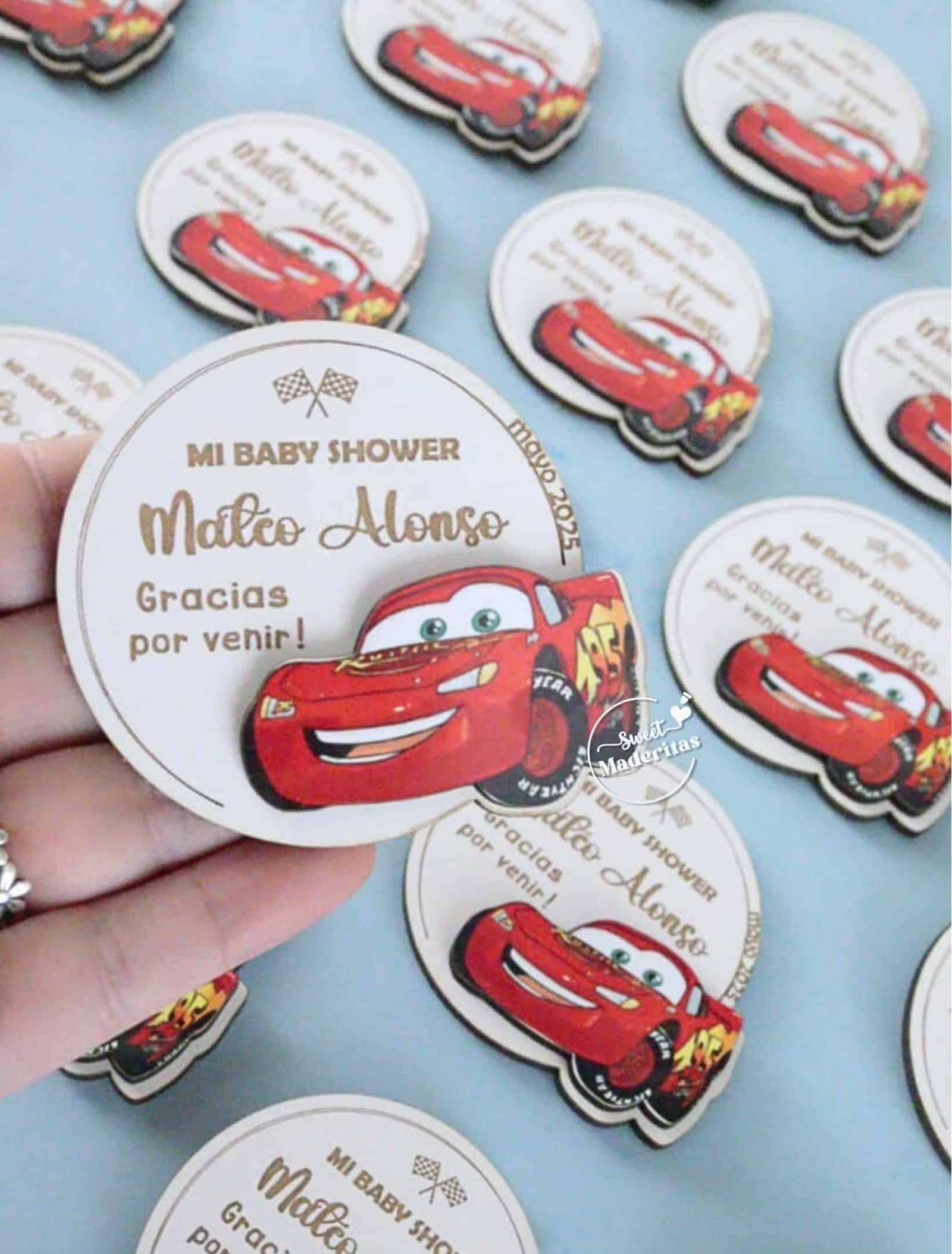 Recuerditos Cumpleaños ,baby shower imantados con figurita de Cars estampada , cada uno en su bolsita de organza listo para regalar 🎁